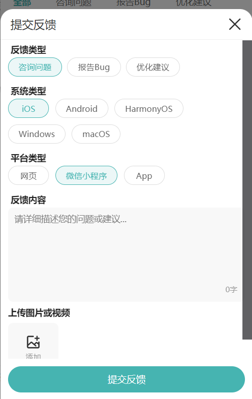 移动端路径:个人中心-反馈中心-选择反馈类型(咨询问题、报告bug、优化建议)-输入详细内容