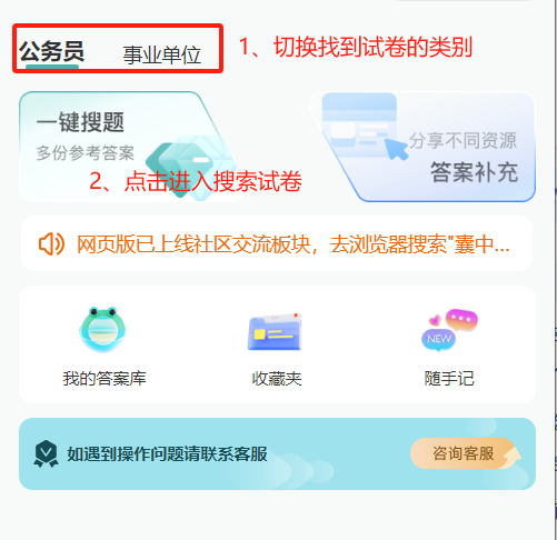 # 查看题目、材料、答案,统一从【一键搜题】入口进入